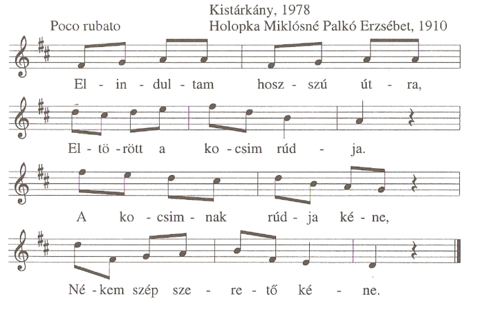 1. Elindultam hosszú útra,Eltörött a kocsim rúdja.A kocsimnak rúdja kéne,Nékem szép szerető kéne.2. Udvaromon van két csirke,Egyik kakas, másik jérce.Megeszem...