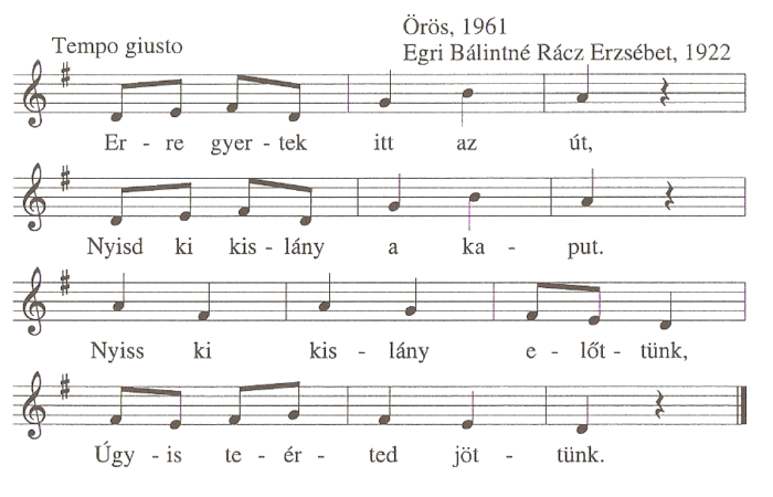 1. Erre gyertek itt z út,Nyisd ki kislány a kaput.Nyiss ki kislány előttünk,Úgy is teérted jöttünk.