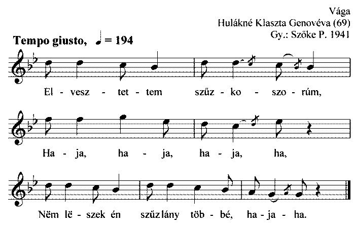 1. Elvesztettem szűzkoszorúm, Haja, haja, haja ha, Nëm lëszek én szűzlány többé, haja ha. 2. Szűzkoszorúm elvesztëttem, Haja, haja, haja,...