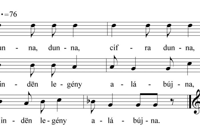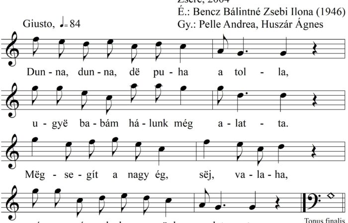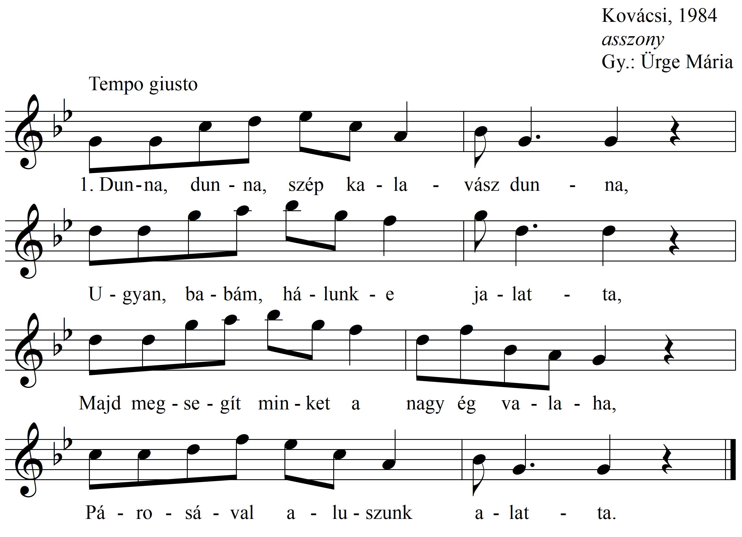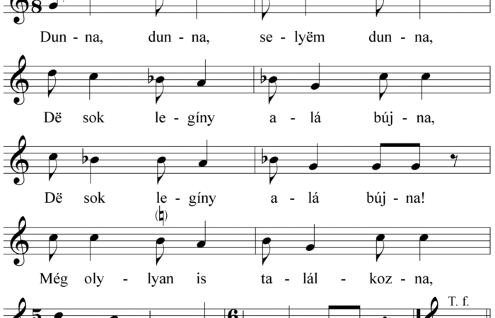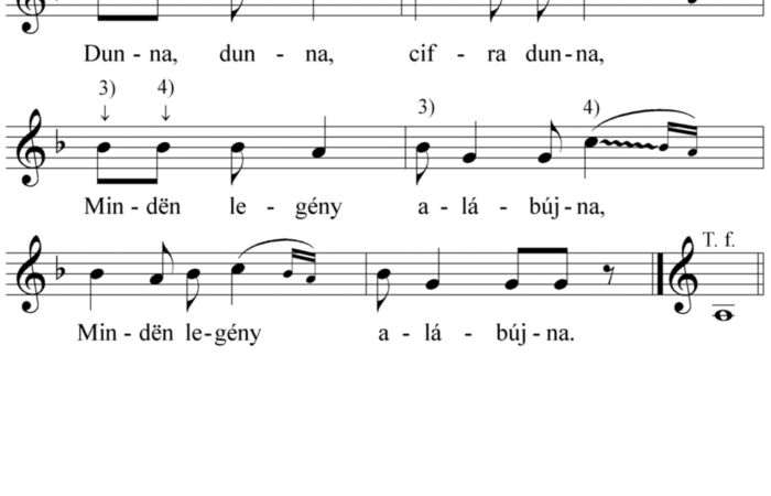 1. Dunna, dunna, cifra dunna, Mindën legény alábújna, Mindën legény alábújna. 2. Még ollyan is találkozna, Szënt György napig ëlalunna,...