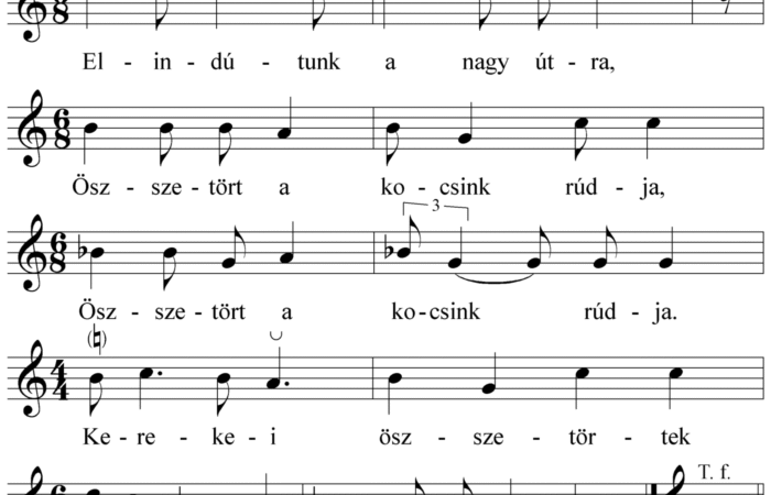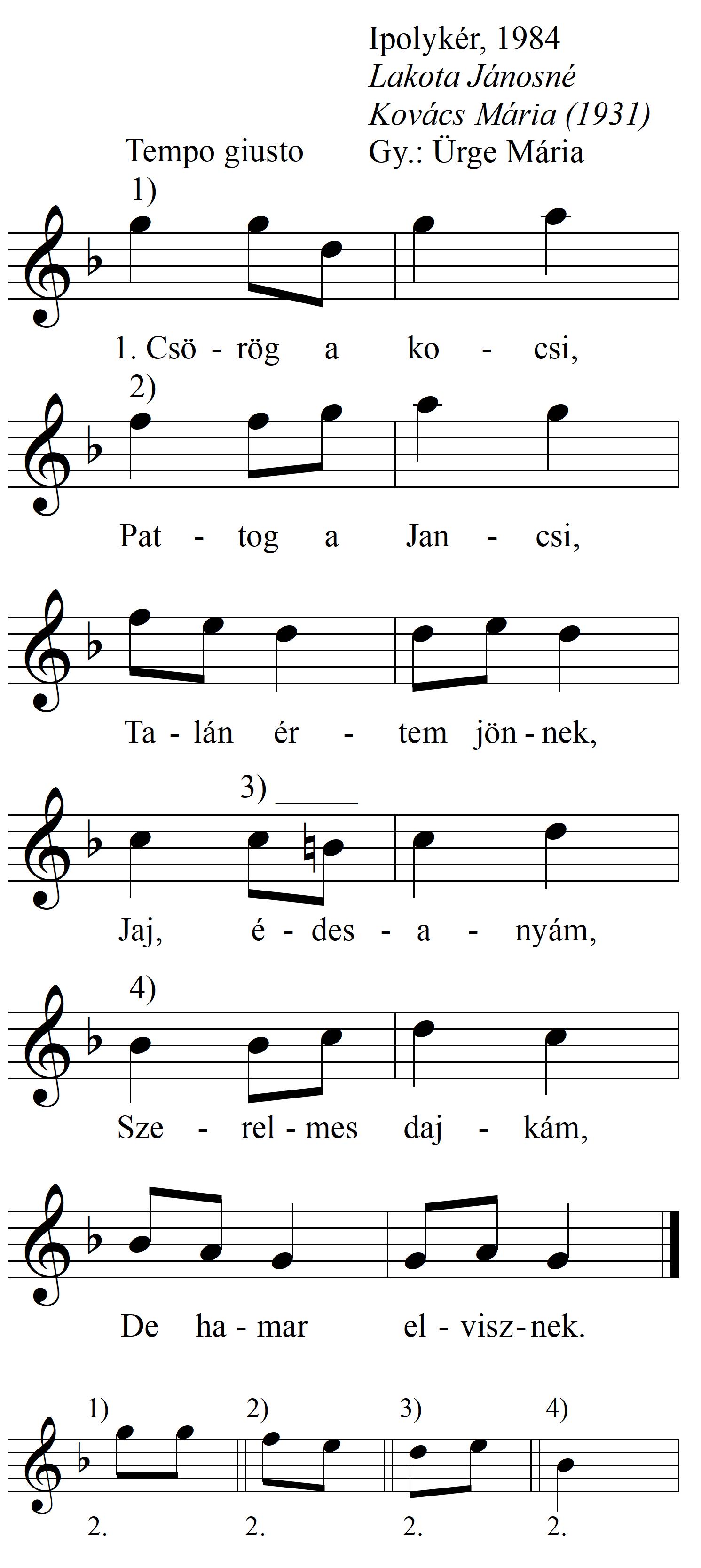 1. Csörög a kocsi, Pattog a Jancsi, Talén értem jönnek, Jaj, édesanyám, szerelmes dajkám, De hamar elvisznek. 2. Széles az...