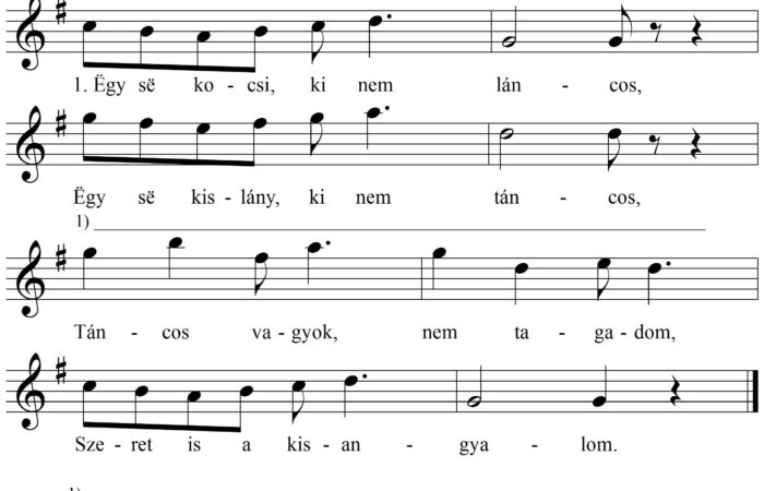 1. Ëgy së kocsi, ki nem láncos, Ëgy së kislány, ki nem táncos, Táncos vagyok, nem tagadom, Szeret is a kisangyalom....