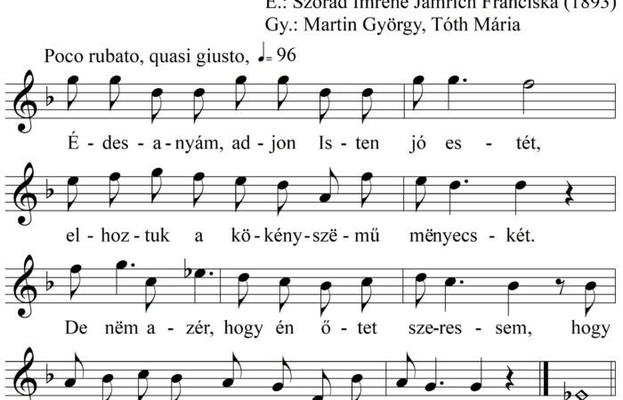 1. Édesanyám adjon Isten jó estét,Hoztam kendnek egy szép barna menyecskét.De nem azért hoztam, hogy én szeressem,Szegény vagyok, gazdagságot szereztem.