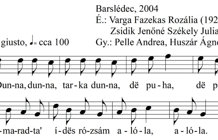 1. Dunna, dunna, tarka dunna, de puha, Kimaradtá‘ ídes rózsám alóla, alóla. 2. Megírjük míg azt az időt valaha, valaha,...