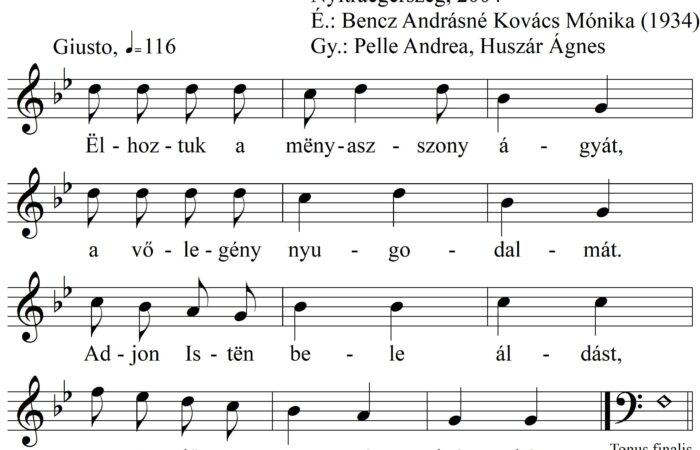 Elhoztuk a menyasszony ágyát, A vőlegény nyugodalmát, Adjon Isten bele áldást, Esztendőre egy szép lyánkát.