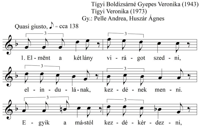 1. Elment a két lány virágot szedni, Elindulának, kezdének menni, Egyik a mástól kezdé kérdezni, Ki volt az este téged...