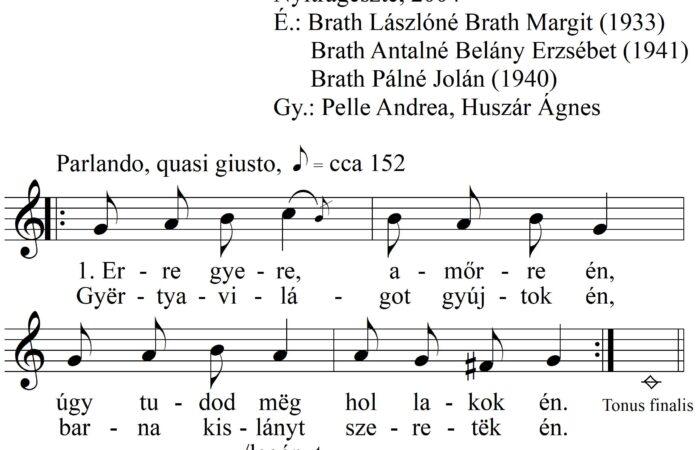 1. Erre gyere, amőrre én, Úgy tudod meg, hol lakok én. 2. Gyertyavilágot gyújtok én, Barna legényt (kislányt) szeretek én....