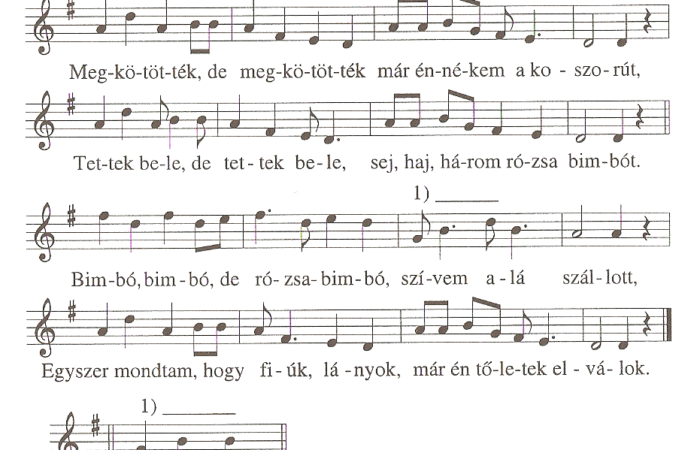 1. Megkötötték, de megkötötték már énnékem a koszorút,Tettek bele, de tettek bele, sej, haj, három rózsa bimbót.Bimbó, bimbó, de rózsa...