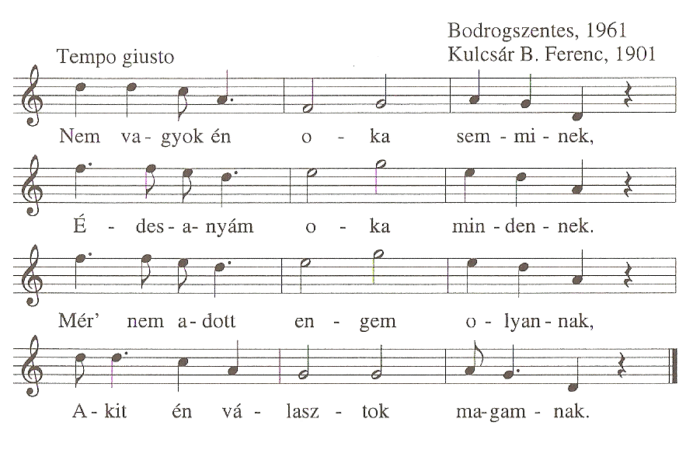 1. Nem vagyok én oka semminek,Édesanyám oka mindennek.Mér nem adott engem olyannak,Akit és választok magamnak.2. Kertünk alatt folyik a Tisza,Közepibe...