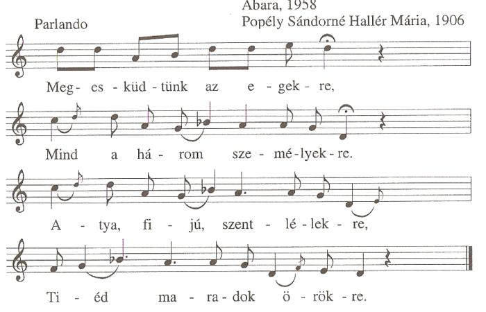 Magasan repül a daru, szárnyát, lábát ingatja, Szárnya alól, farka alól bodor tollát hullatja. Szëdjed babám, szëdjed, kalapom mellé szëdjed,...