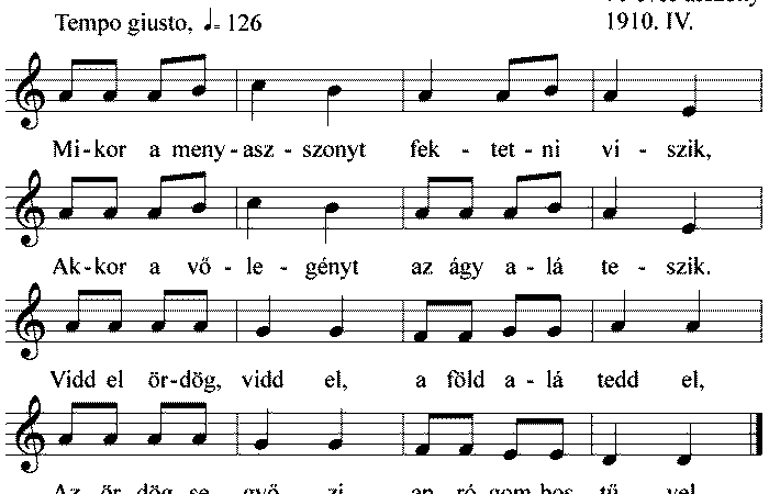 1. Mikor a menyasszonyt fektetni viszik, Akkor a vőlegényt az ágy alá teszik. Vidd el ördög, vidd el, a föld alá...