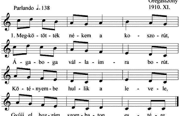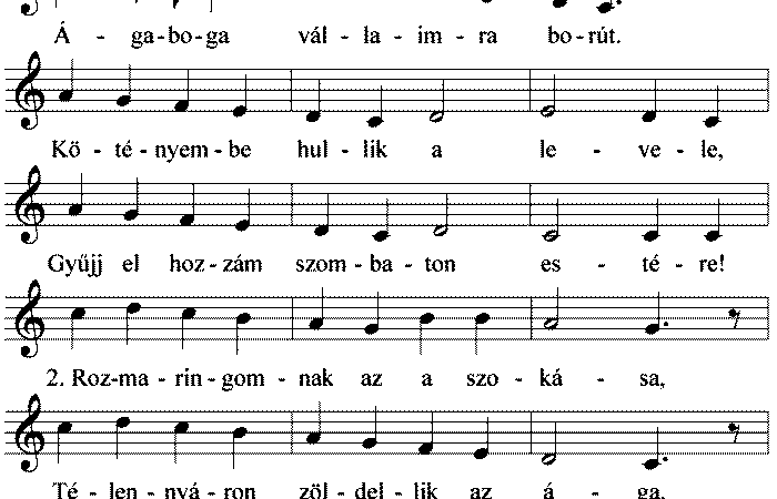 1. Megkötötték nékem a koszorút, Ágaboga vállaimra borút. Kötényembe hullik a levele, Gyűjj el hozzám szombaton estére! 2. Rozmaringomnak az...