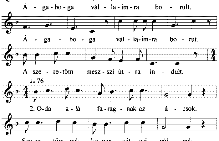 1. Megkötötték nékem a koszorút, Ágaboga vállaimra borult, Ágaboga vállaimra borút, A szeretőm messzi útra indult. 2. Oda alá faragnak...