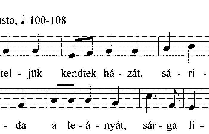 1. Megtiszteljük kendtek házát, sáridrom, Adja oda a leányát, sárga liliom. 2. Mit csináljunk, édes apjuk, sáridrom, Od’adjuk-e, vagy megtartsuk,...