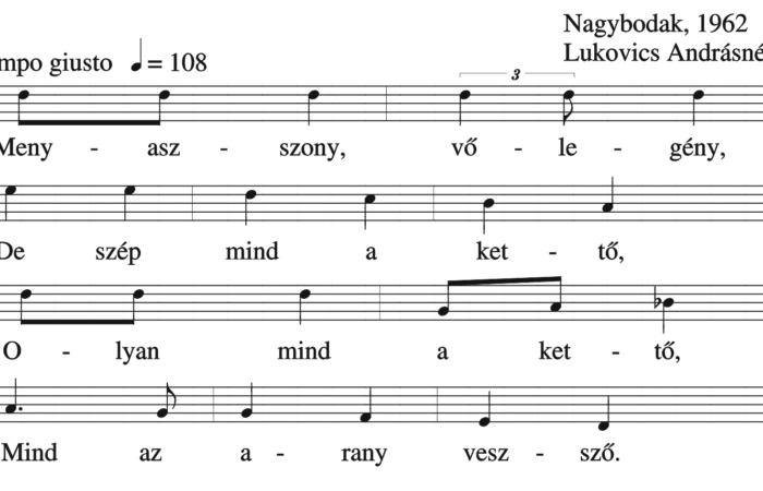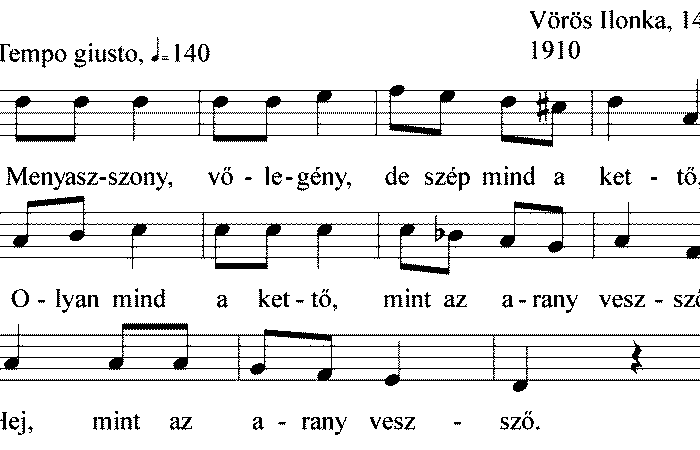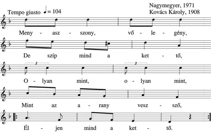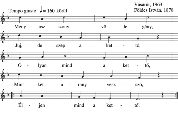 Menyasszony, vőlegény, Juj, de szép a kettő, Olyan mind a kettő, Mint két arany vessző, Éljen mind a kettő.
