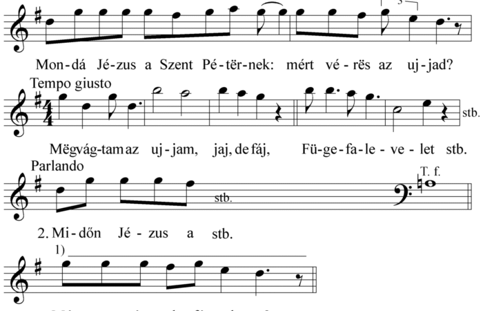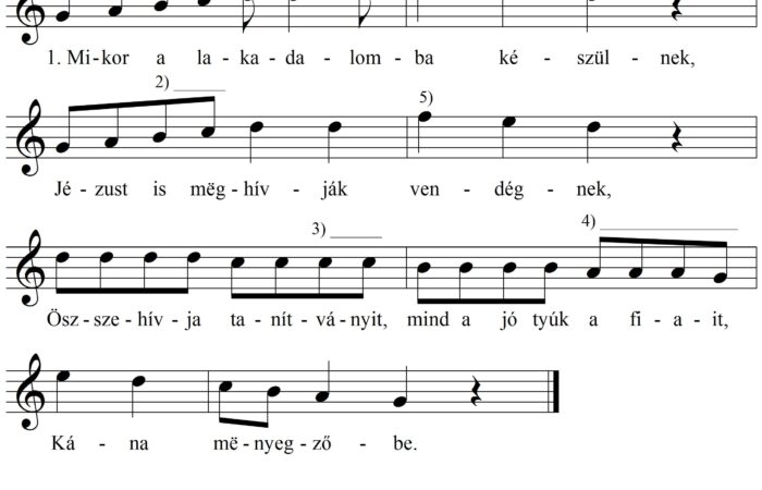 1. Mikor a lakadalomba készülnek, Jézust is mëghívják vendégnek, Összehívja tanítványit, mind a jó tyúk a fiait, Kána mënyegzőbe. 2. Pétër a szakállat törüli,...