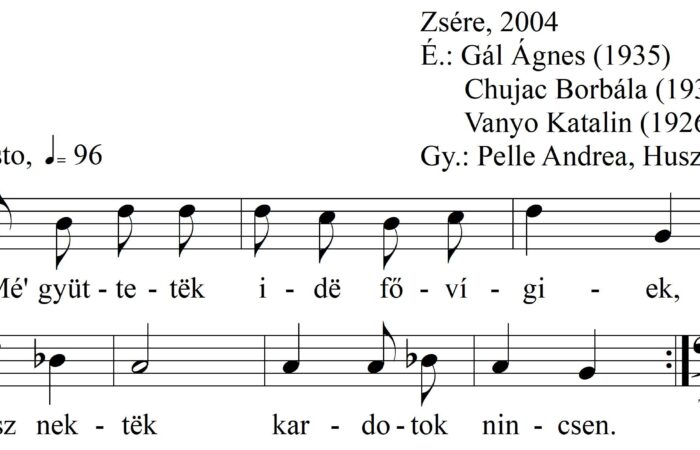 1. Menyasszonyunk ojan szép, Szëme, szájo csak úgy ég. Levelibe van, levelibe van, Lëjány a leginy ölibe van. 2. Kelj...