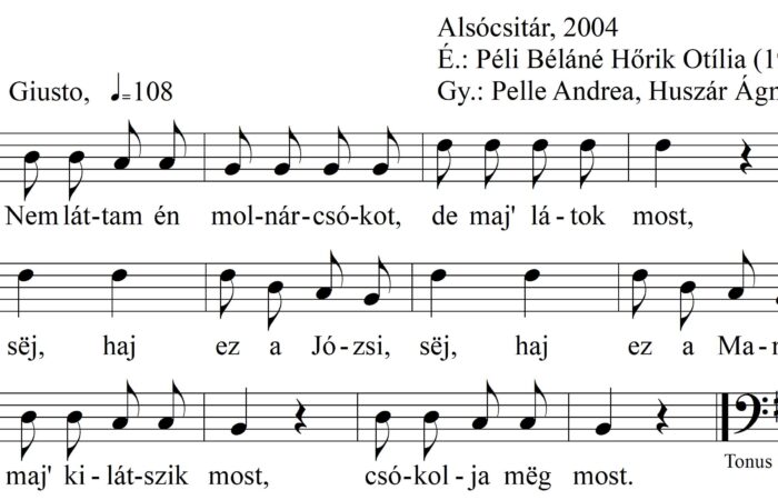 Nem láttam én molnárcsókot, de maj‘ látok most, Sej, haj, ez a Józsi, sej, haj, ez a Mari Maj‘ kilátszik...