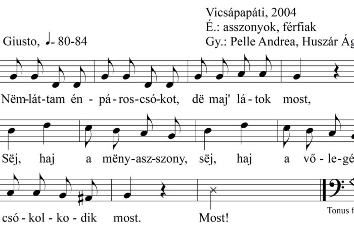 Nem láttam én pároscsókot, de maj‘ látok most, Sej, haj, a menyasszony, sej, haj, a vőlegény Csókolkodik most. Most!