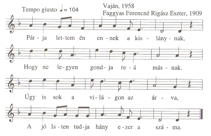 1. Párja lettem és ennek a kislánynak,Hogy ne legyen gondja reá másnak.Úgy is sok a világon az árva,A jó Isten...