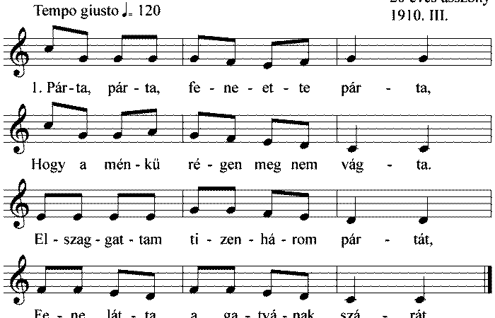 1. Párta, párta, feneette párta, Hogy a ménkű régen meg nem vágta. Elszaggattam tizenhárom pártát, Fene látta a gatyának szárát....
