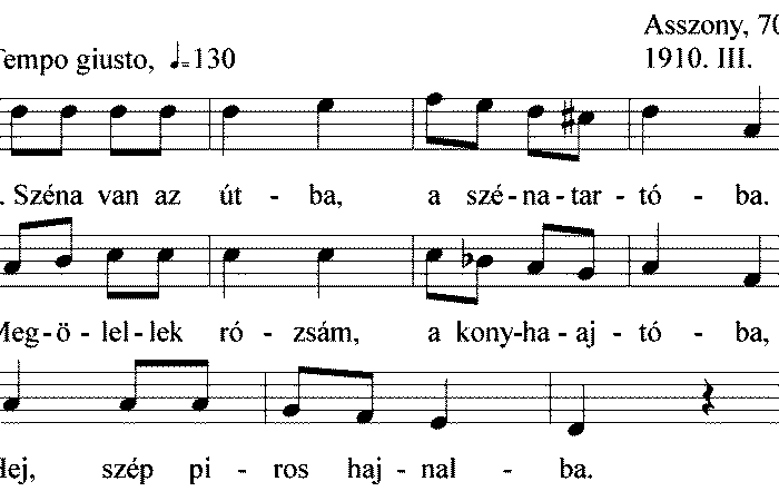 1. Széna van az útba, a szénatartóba. Megölellek rózsám, a konyhaajtóba, Hej, szép piros hajnalba. 2. Ha éntőlem elválsz, legyen...