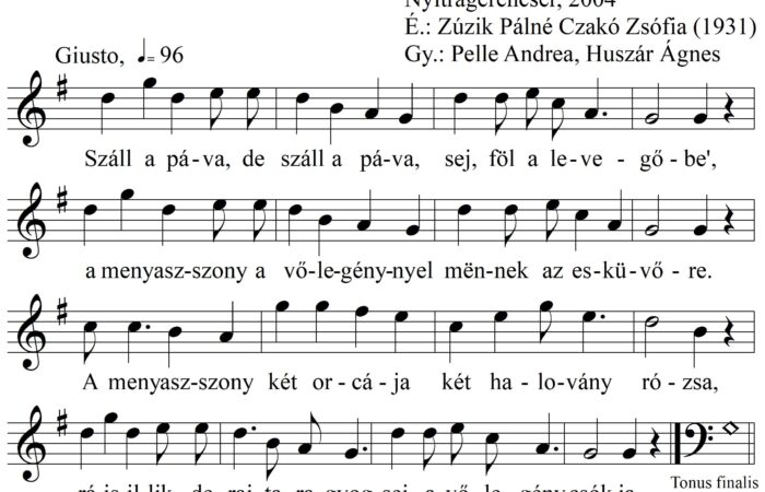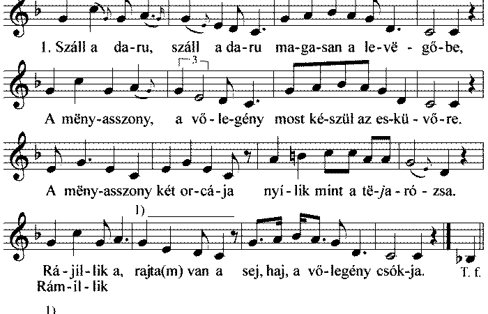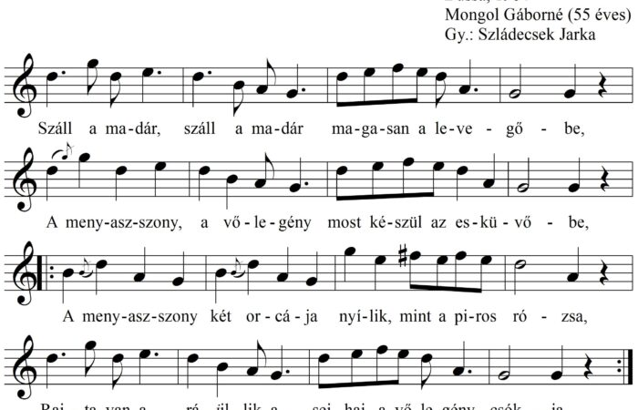 Száll a madár, száll a madár magasan a levegőbe, A menyasszony, a vőlegény most készül az esküvőbe, A menyasszony két orcája nyílik, mint a piros rózsa, Rajta...