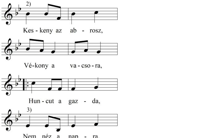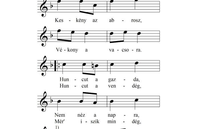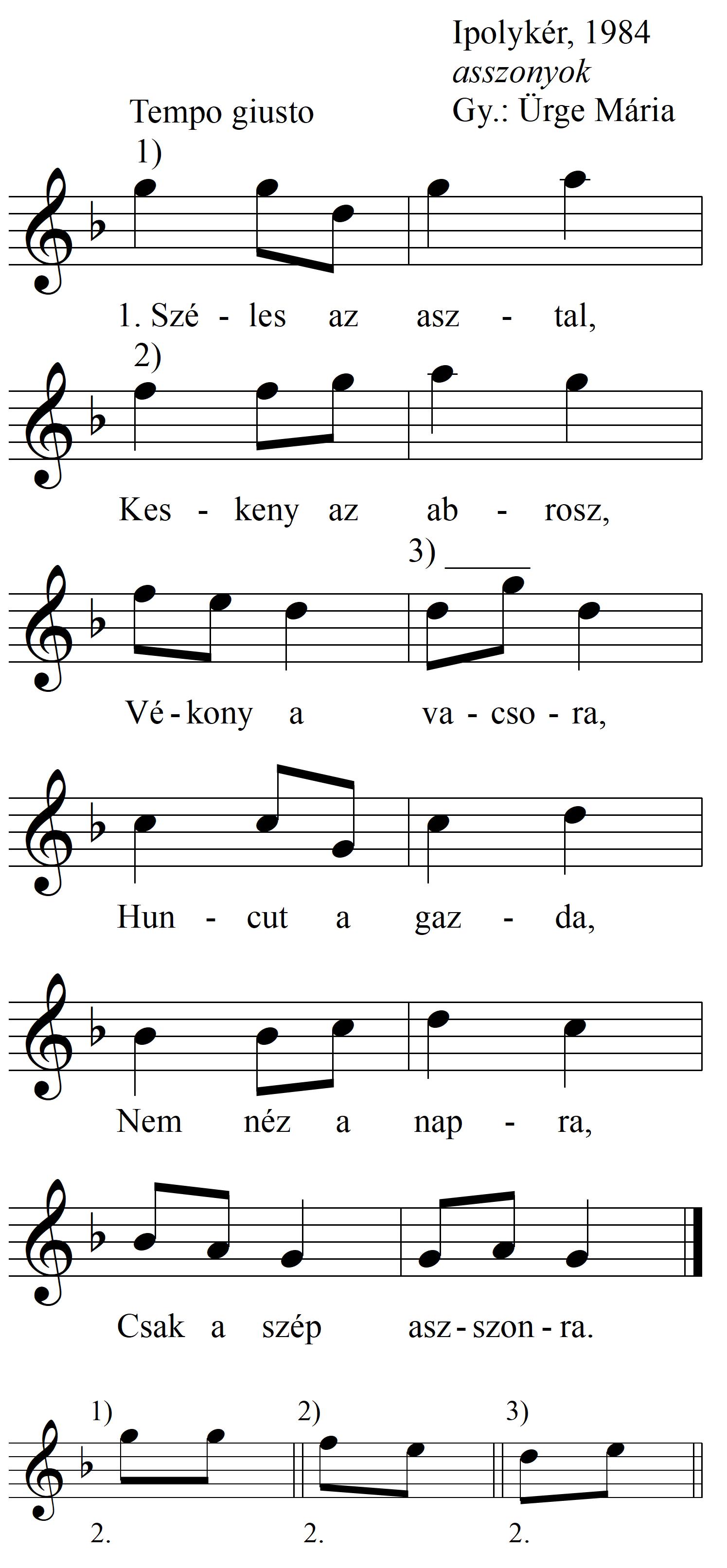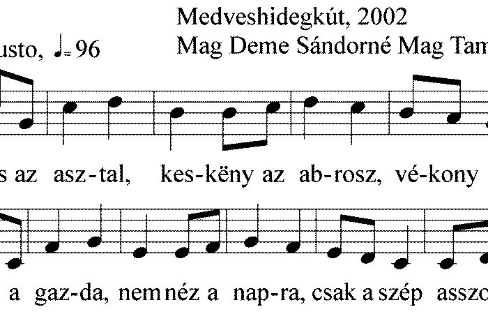 Szélës az asztal, Keskëny az abrosz, Vékony a vacsora. Huncut a gazda, Nem néz a napra, Csak a szép asszonra. Huncut a vendég, Mér‘ iszik...