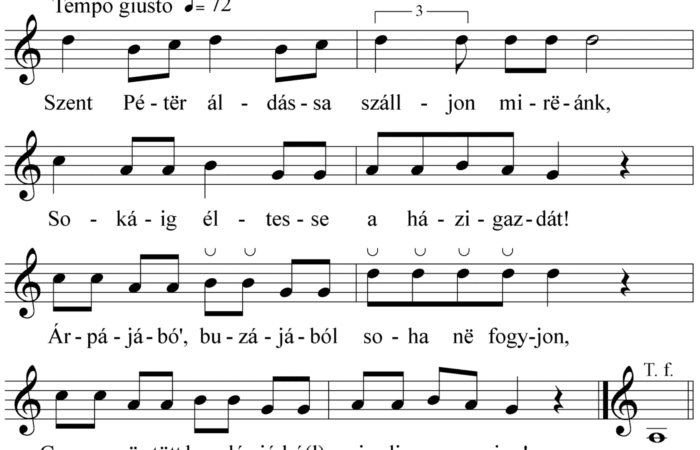 Szent Pétër áldása szálljon mirëánk, Sokáig éltesse a házigazdát! Árpájábó’, buzájából soha në fogyjon, Csapra ütött hordójából soha ki ne...