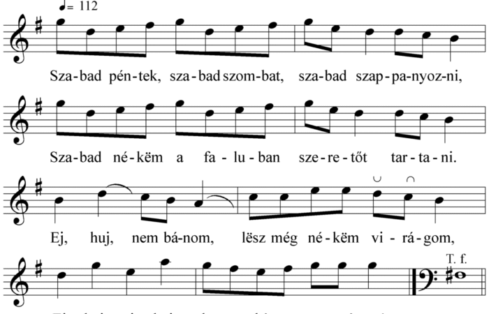 Szabad péntek, szabad szombat, szabad szappanyozni, Szabad nékëm a faluban szeretőt tartani. Ej, huj, nem bánom, lësz még nékëm virágom,...