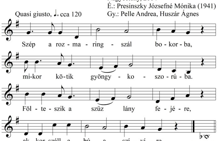Szép a rozmaringszál bokorba, Mikor kötik gyöngykoszorúba, Fölteszik a szűz lány fejére, Akkor száll a bú a szívíre.