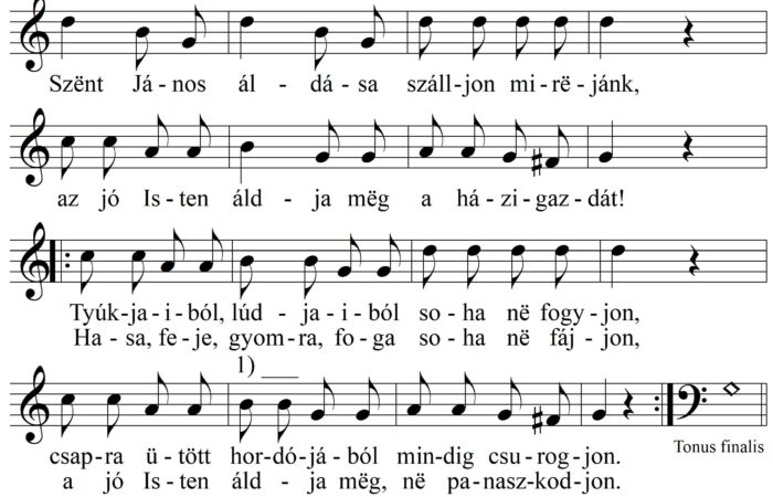 Szent János áldása szálljon mirejánk, A jó Isten áldja meg a házigazdát, Tyúkjaiból, lúdjaiból soha ne fogyjon, Csapra ütött hordójából...