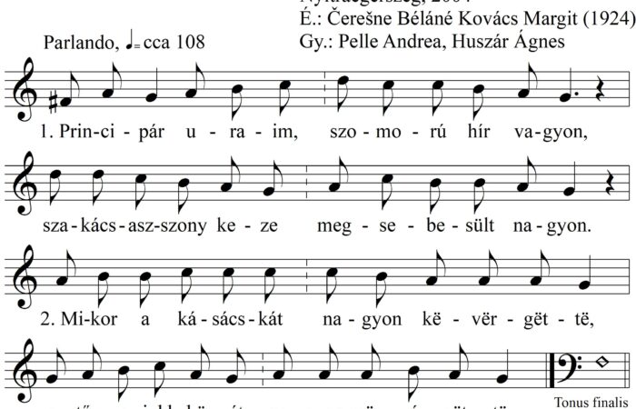 1. Principár uraim szomorú hír vagyon, Szakácsasszony keze megsebesült nagyon. 2. Mikor a kásácskát nagyon kevergette, A tűz a jobb...