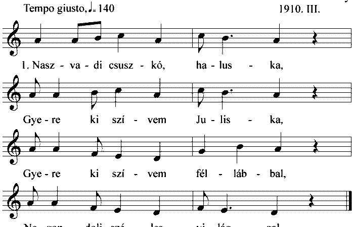 1. Naszvadi csuszkó, haluska, Gyere ki szívem Juliska, Gyere ki szívem féllábbal, Ne gondolj széles világgal. 2. Megért kalászt aratni...