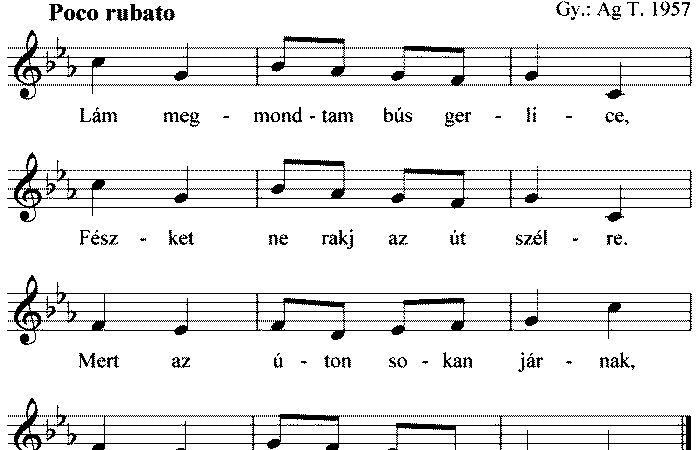 1. Lám megmondtam bús gerlice, Fészket ne rakj az út szélre. Mert az úton sokan járnak, Fiaidra rátalálnak. 2. Menj...