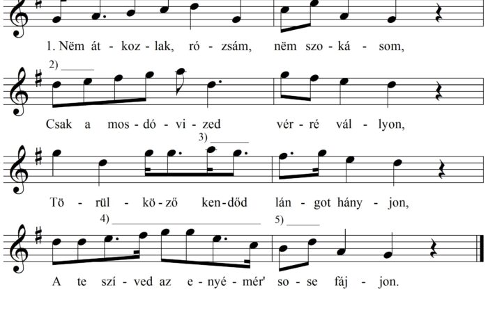 1. Nëm átkozlak, rózsám, nëm szokásom, Csak a mosdóvized vérré vállyon, Törülköző kendőd lángot hányjon, A te szíved az enyémér‘ sose fájjon....