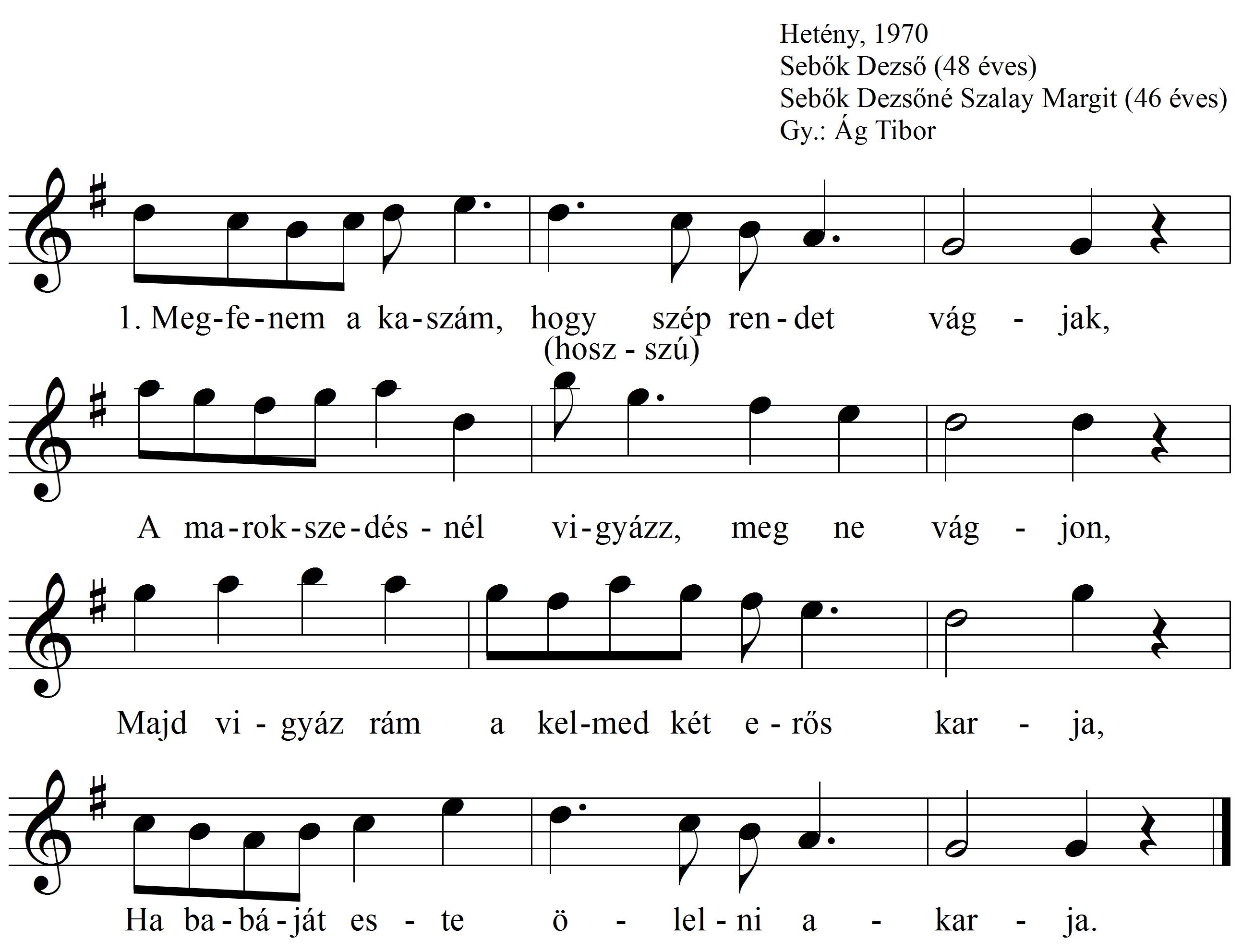 1. Megfenem a kaszám, hogy szép (hosszú) rendet vágjak, A marokszedésnél vigyázz, meg ne vágjon, Majd vigyáz rám a kelmed két erős karja,...