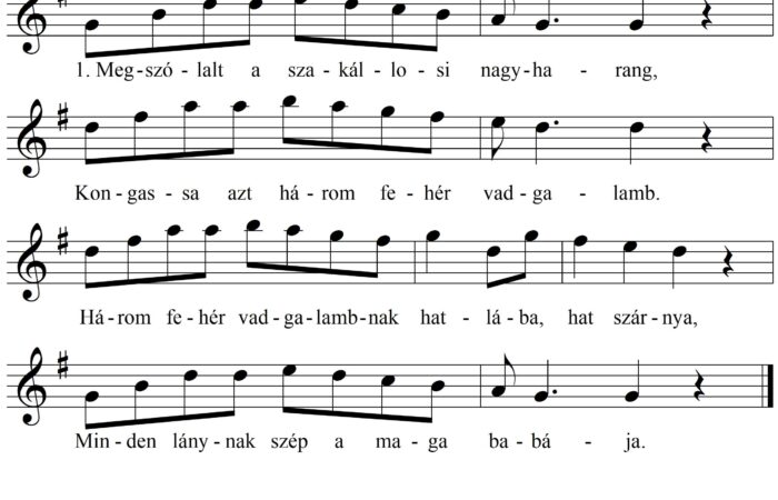 1. Megszólalt a szakállosi nagyharang, Kongassa azt három fehér vadgalamb. Három fehér vadgalambnak hat lába, hat szárnya, Minden lánynak szép...