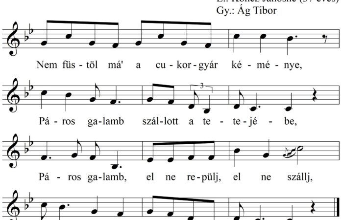 Nem füstöl má’ a cukorgyár kéménye, Páros galamb szállott a tetejébe, Páros galamb, el ne repülj, el ne szállj, Mer’...