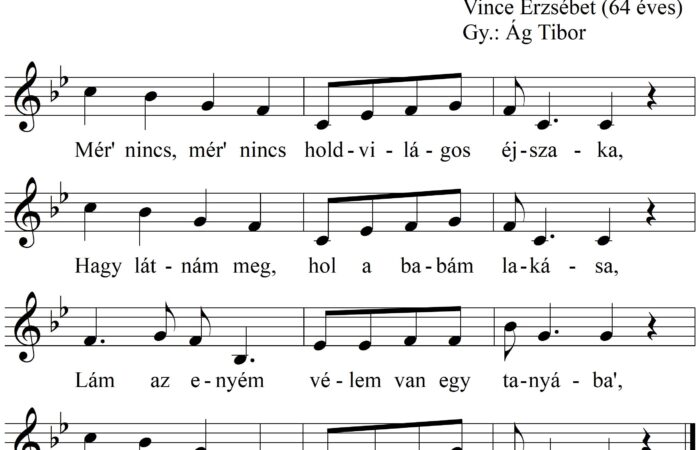 Mér’ nincs, mér’ nincs, holdvilágos éjszaka, Hagy látnám meg, hol a babám lakása, Lám az enyém vélem van egy tanyába’...