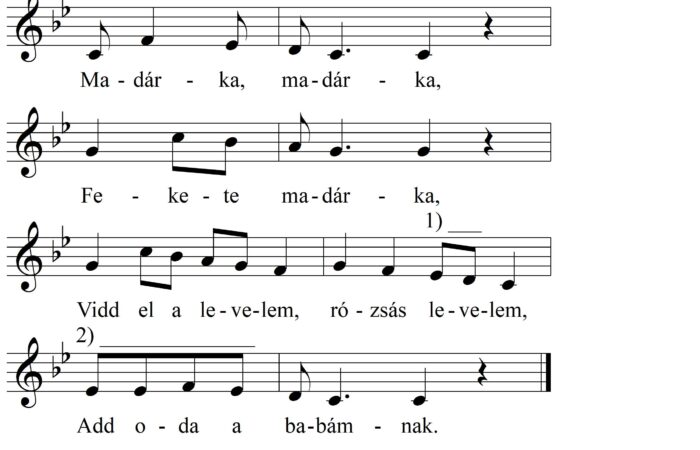 1. Madárka, madárka, Fekete madárka, Vidd el a levelem, rózsás levelem, Add oda a babámnak. 2. Ha kérdi, ki küldte,...