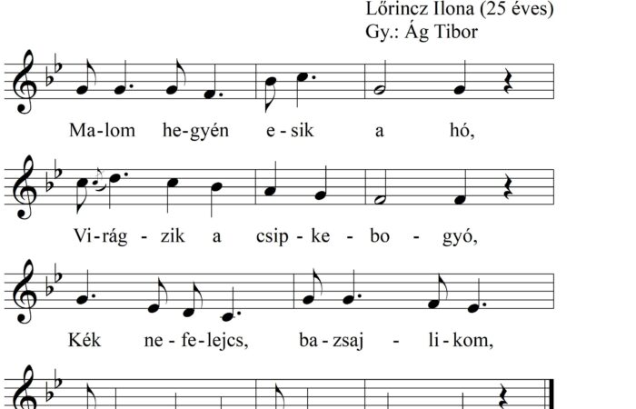 1. Malom hegyén esik a hó, Virágzik a csipkebogyó, Kék nefelejcs, bazsajlikom, Ne feledj el, kis angyalom. 2. A kecsői...