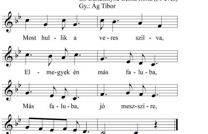 1. Most hullik a veres szilva, Elmegyek én más faluba, Más faluba, jó messzire, Nem leszek senki terhére. 2. Rózsám,...
