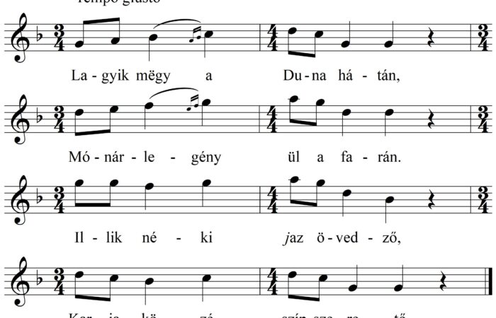 1. Lagyik mëgy a Duna hátán, Mónár legény ül a farán. Illik néki jaz övedző, Karja közé szíp szerető. 2....