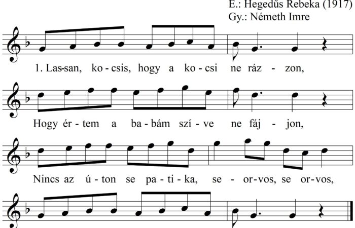 1. Lassan kocsis, hogy a kocsi ne rázzon, Hogy értem a babám szíve ne fájjon, Nincs az úton se patika,...