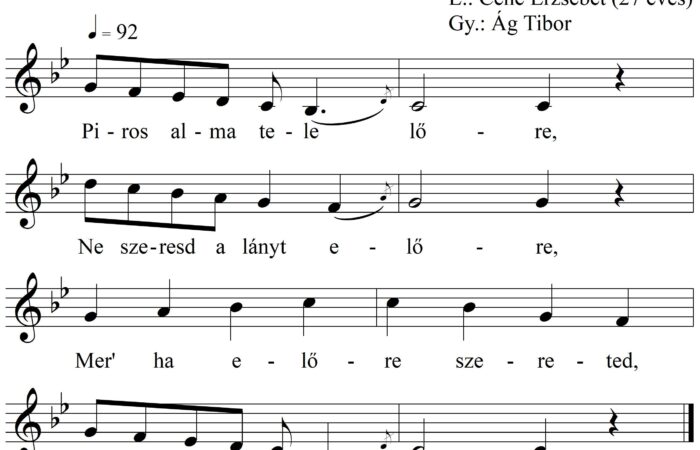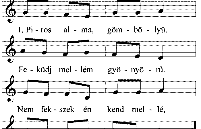 1. Piros alma, gömbölyű Feküdj mellém gyönyörű. Nem fekszek én kend mellé, Úgysem leszek az övé. 2. Édes alma csutkája,...