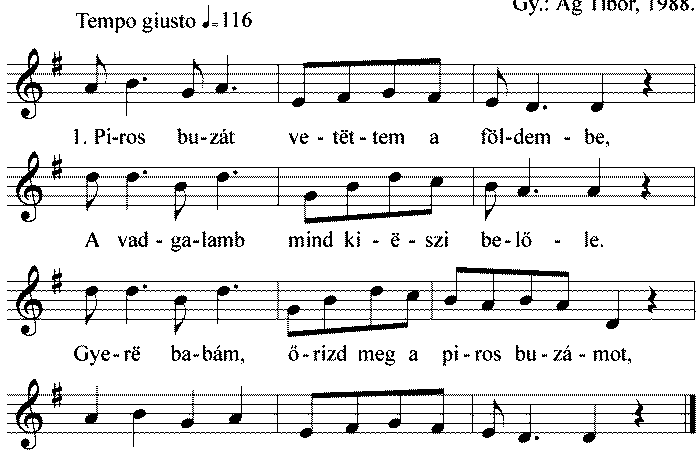 1. Piros buzát vetëttem a földembe, A vadgalamb mind kiëszi belőle, Gyerë babám őrizd meg a piros buzámat, Még az...
