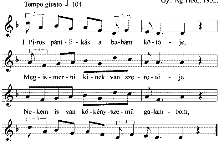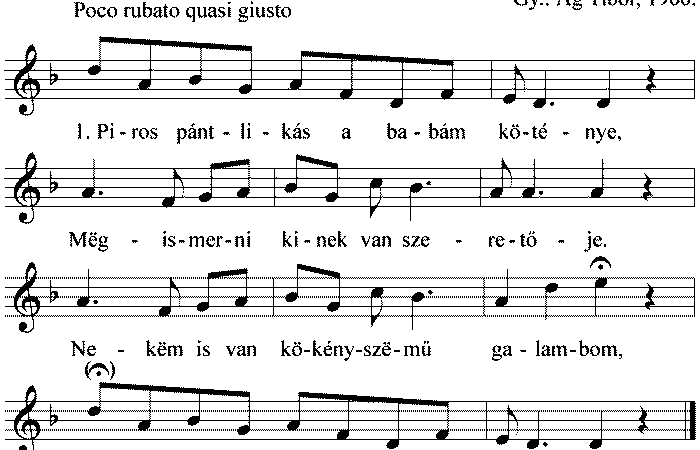 1. Piros pántlikás a babám kötője, Megismerni, kinek van szeretője, Nekem is van kökényszemű galambom, Megölelem akkor, mikor akarom. 2....