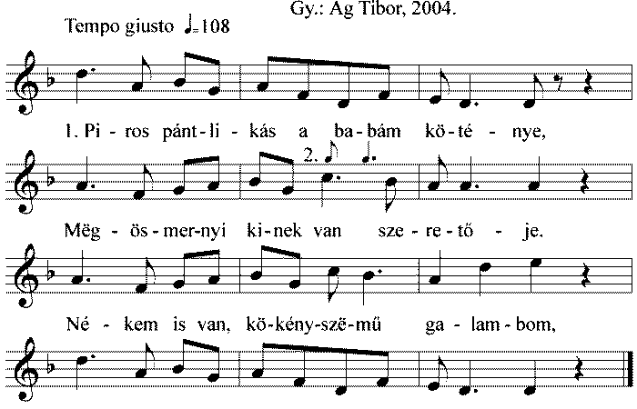 1. Piros pántlikás a babám köténye, Mëgösmernyi, kinek van szeretője, Nékem is van kökényszemű galambom, Mëgölelëm akkor, mikor akarom. 2....