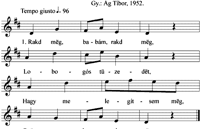 1. Rakd mëg, babám, rakd mëg, Lobogós tüzedët. Hagy melegítsem mëg, Gyënge kezeimët. 2. Megraktam a tüzet, Már el is...